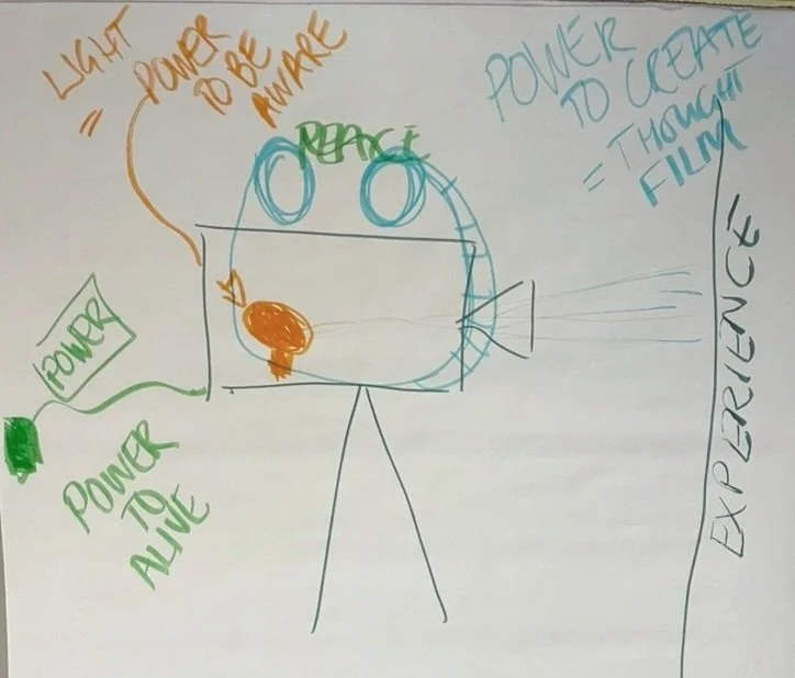 Consciousness is the lightbulb, our special effects team. It is the power to be aware. It shines a light on our thoughts and brings them to life. Sometimes the light is dim, and we can’t see what we’re thinking very clearly. Other times it’s bright and our thoughts are clear on the screen. If we are unconscious there is nothing to shine on the film, so the screen is black.